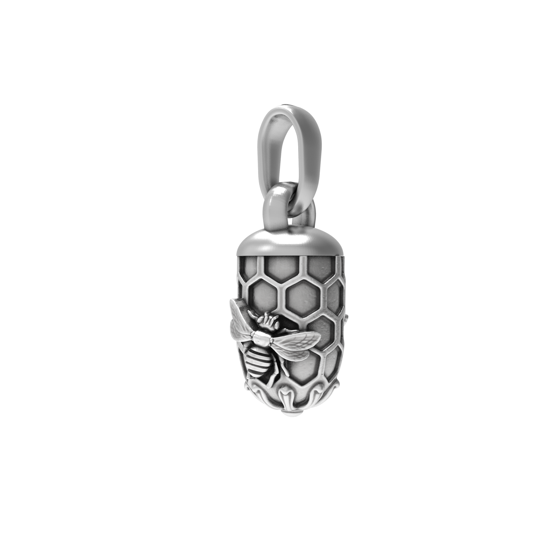 Un pendentif raffiné inspiré du monde naturel, représentant un nid d’abeille stylisé surmonté d’une abeille délicatement posée.